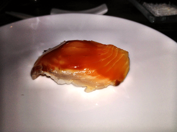 A sushi piece of chopped scallop ($6) comes with quail egg and trout roe, another heavenly bite. When I dream, this is what I dream of. Order it.