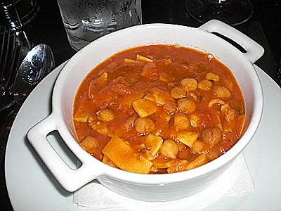 The place is bright with white and yellow hues and a ceiling two stories high. It's a very comfortable place to dine. Before we even ordered, the chef sent us out two croquettes, which were delicious! We were also sent out a bowl of chickpeas and sliced pasta in a tomato sauce, which tasted very homey and comforting.