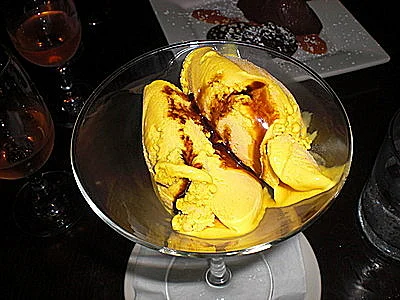 For dessert we had the chocolate “salami” roll with crunchy almonds, dry cookies and caramel sauce, served with chocolate sorbet ($10) as well as the Marsala wine and whipped egg yolk ice cream with a drizzle of balsamic vinegar ($12). Both desserts were fine, but nothing to write home about.