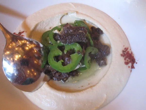 Start with the hommus ($7.50), creamy, silky, and delicious. Add some lamb and jalapeno for kick. Place it into the warm, fresh pocket pitas that come out with each order, and have a bite of joy. It rocks!