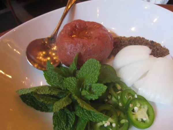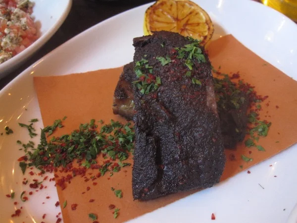 Maybe some meat tickles your culinary fancy, so try the kibbe nayeh jnubieh ($14) (steak tartar, burghul, onion, mint) or a succulent and tasty lamb rib ($20) with a sour cherry sauce and scallions.