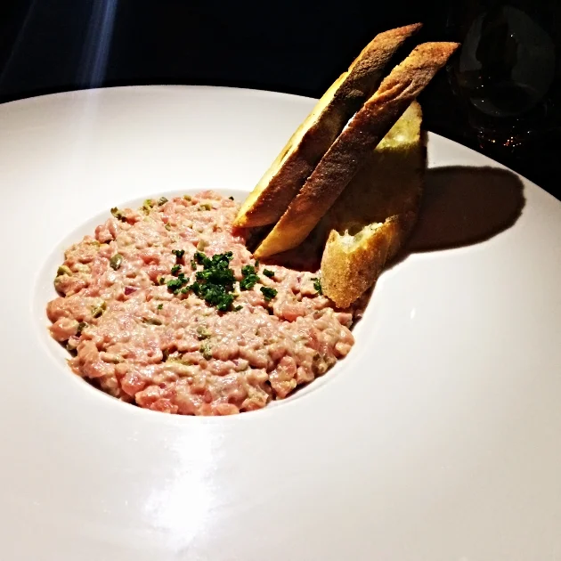 Beef Tartare $17) comes with smoked egg vinaigrette & toasted baguette. Greatness.