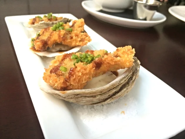 Panko Fried Oysters are served on the half shell over house made tartar sauce, topped with chili infused tonkatsu sauce, and chopped chives. They are great. Order them.